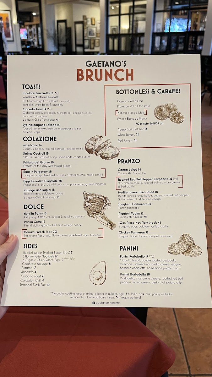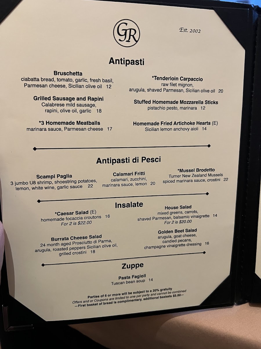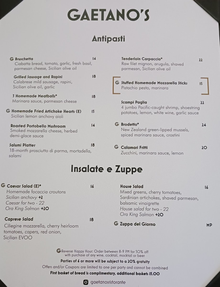 Gaetano's menu offers a delightful array of Italian classics, showcasing the culinary prowess of its chefs. Start your meal with their Bruschetta, a heavenly combination of ciabatta bread topped with diced tomatoes, garlic, extra virgin olive oil, basil, and Parmesan cheese that ignites your taste buds for only $12. Or indulge in the Tenderloin Carpaccio, exquisitely presented with arugula and shaved Parmesan, a perfect appetizer for those seeking a sophisticated bite at $22.